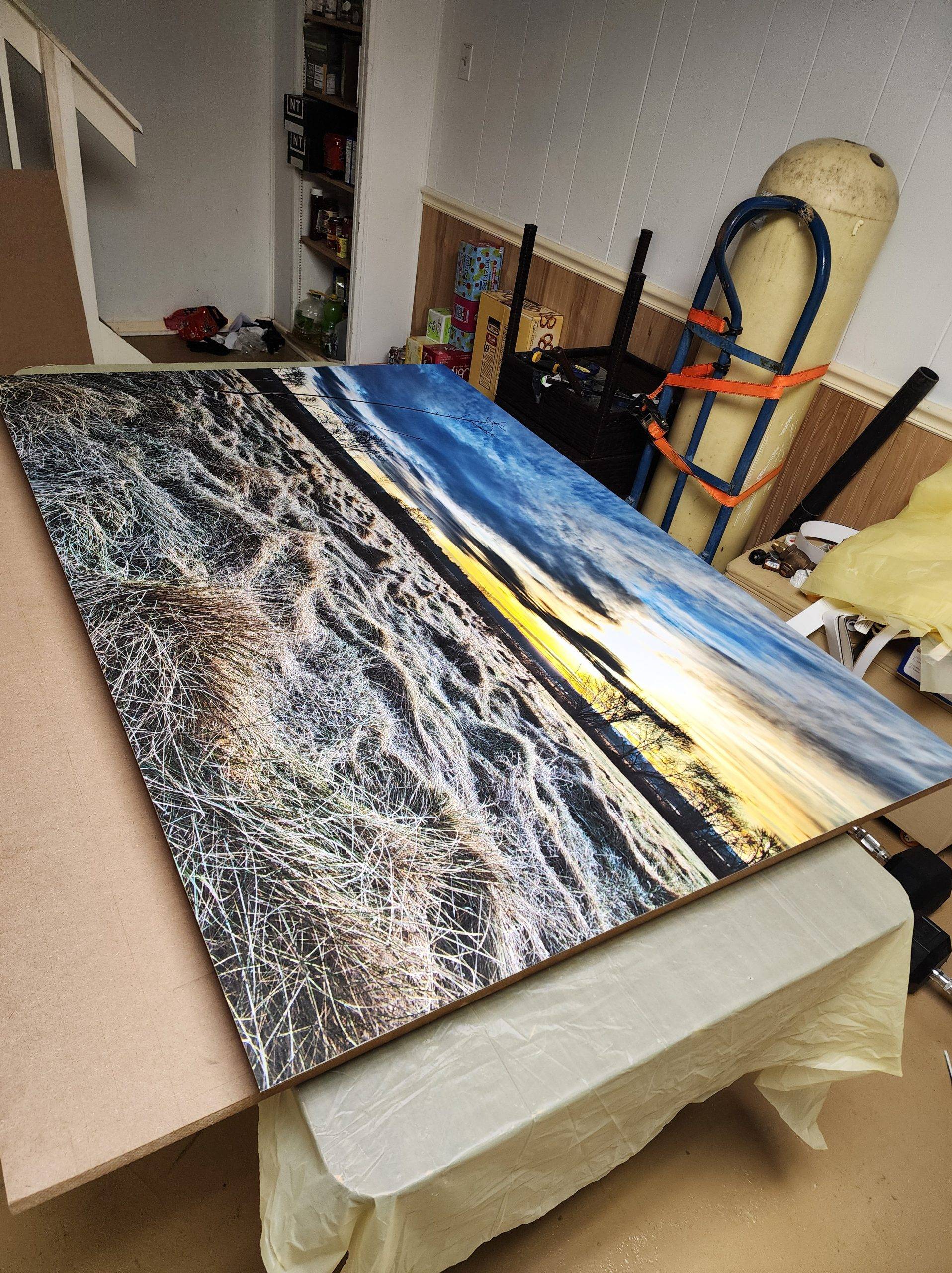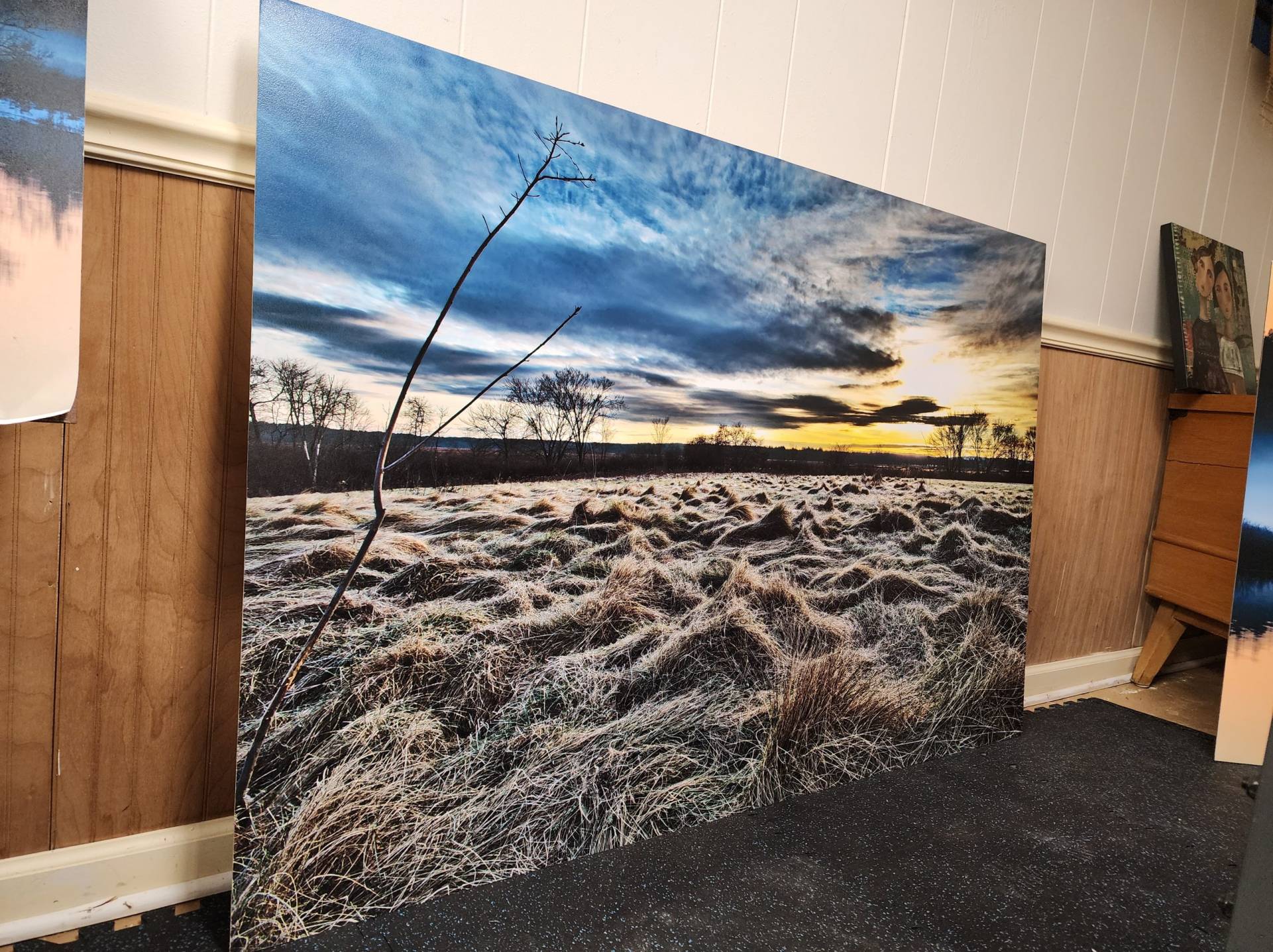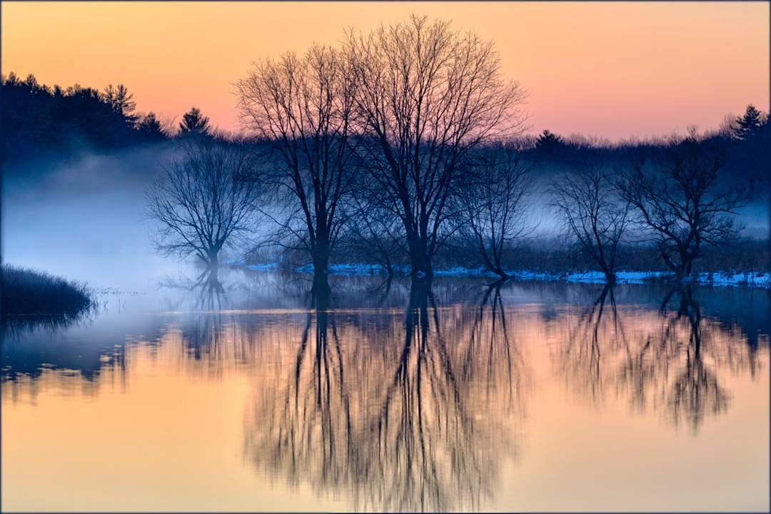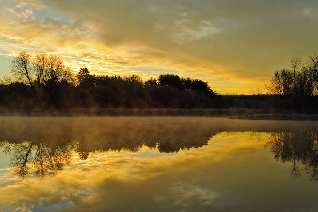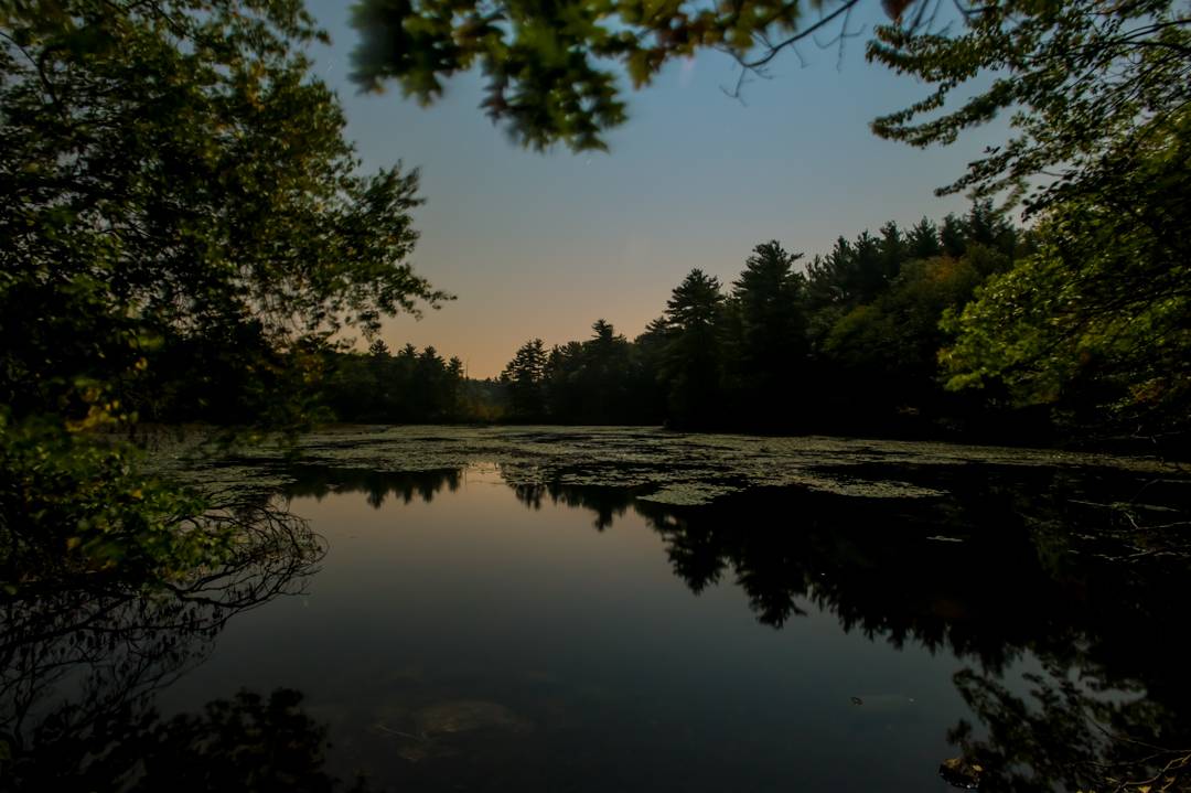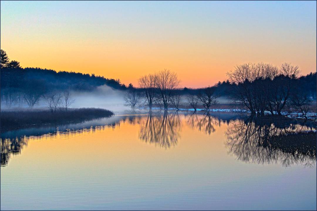 As the Sun went down over duck pond the blue from the sky and the pond became one. With fluffy clouds reflecting heire glory….Blue sky sunset –